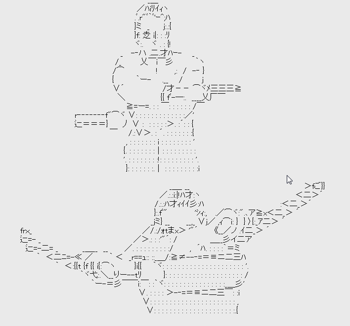 .`[.:´ヾ:.:.:.:.:.:.:.:.:.:.:.:.:.:.:.:.:.{ 、 }:.:.:.、/;;;;;;;;;;li ソ./:.:.:.:.:.:{ l! }:.:.:.:.:.:.:.:.:∥:.:./:.:.:.:.:.::l.:.:.:.:.:.:.:.:.:{ニア`⌒´ゞ=ニニニニ.} :.:.:.:.:.{//////////////////////} :!